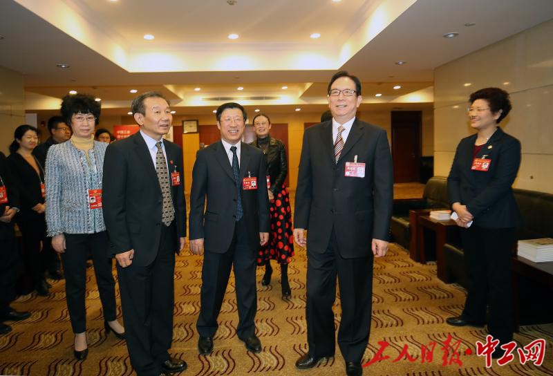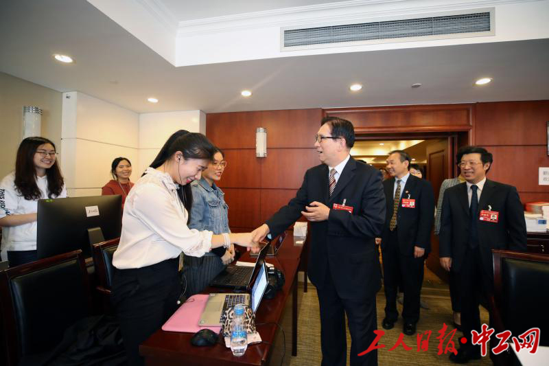 李玉赋看望新闻中心工作人员。工人日报·中工网记者 杨登峰摄