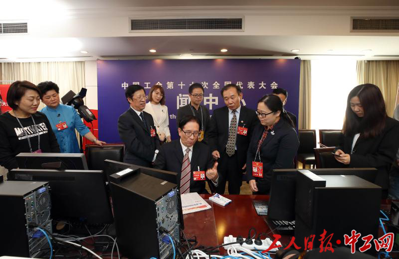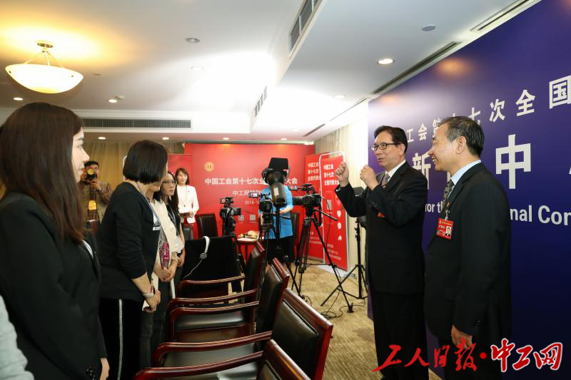 李玉赋在中国工会十七大新闻中心。工人日报·中工网记者 杨登峰摄