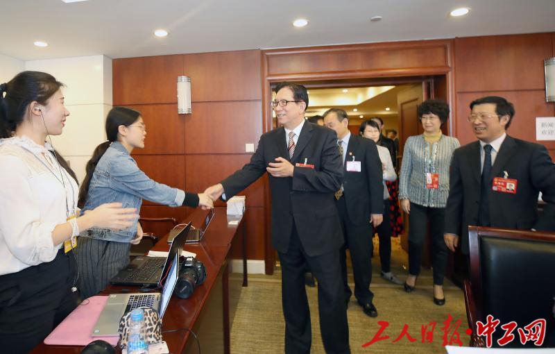 李玉赋与新闻中心工作人员握手。工人日报·中工网记者 杨登峰摄