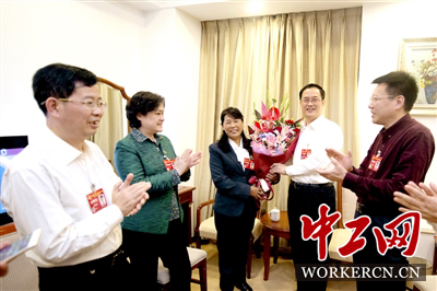 10月24日晚,在环卫工人节到来之际,正在出席中国工会十七大的福建省人大常委会副主任、省总工会主席黄琪玉(右二)看望了代表团中的环卫工人代表罗祥英(中)并为她送上鲜花。