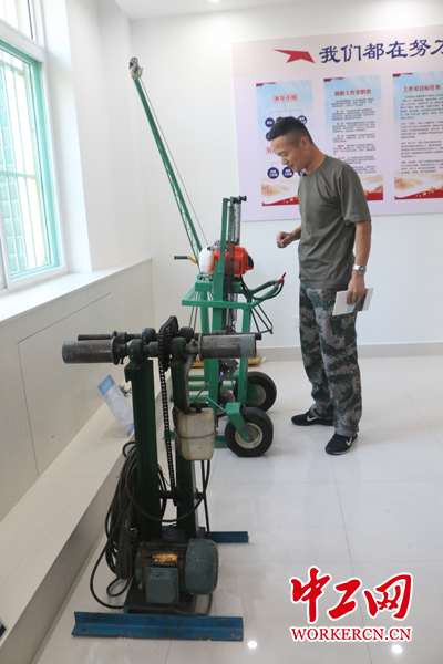 李涛在介绍他参与的发明、改进机器工具。中工网记者 朱晶晶 摄