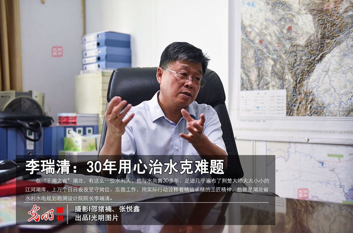 在“千湖之省”湖北,有这么一位水利人,他与水共舞30多年,足迹几乎遍布了荆楚大地大大小小的江河湖库,上万个日日夜夜坚守岗位、忘我工作,用实际行动诠释着精益求精的工匠精神,他就是湖北省水利水电规划勘测设计院(以下简称“湖北水院”)院长李瑞清。(光明网记者 邵绪楠摄/光明图片)