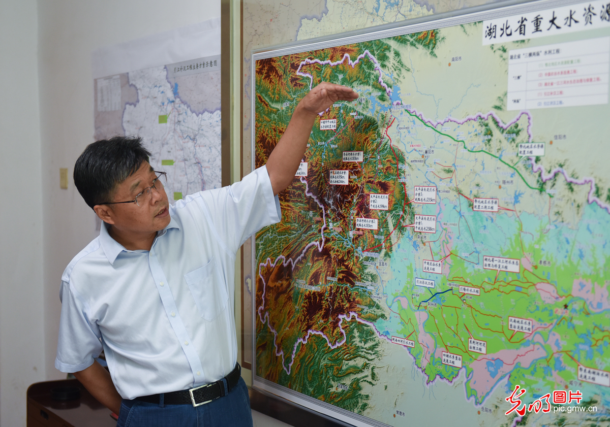 湖北的地理区位特殊,江汉平原“水袋子”三年两涝,鄂北岗地“旱包子”十年九旱,曾面临着水资源分布不均、水环境污染等问题。如何寻求新的路径,从根上破解这种“瓶颈”。李瑞清带领湖北水院专家技术团队迎难而上,提出湖北省“三横两纵”水资源建设总体战略格局。图为2019年8月26日,李瑞清在介绍湖北省重大水资源配置。(光明网记者 邵绪楠摄/光明图片)