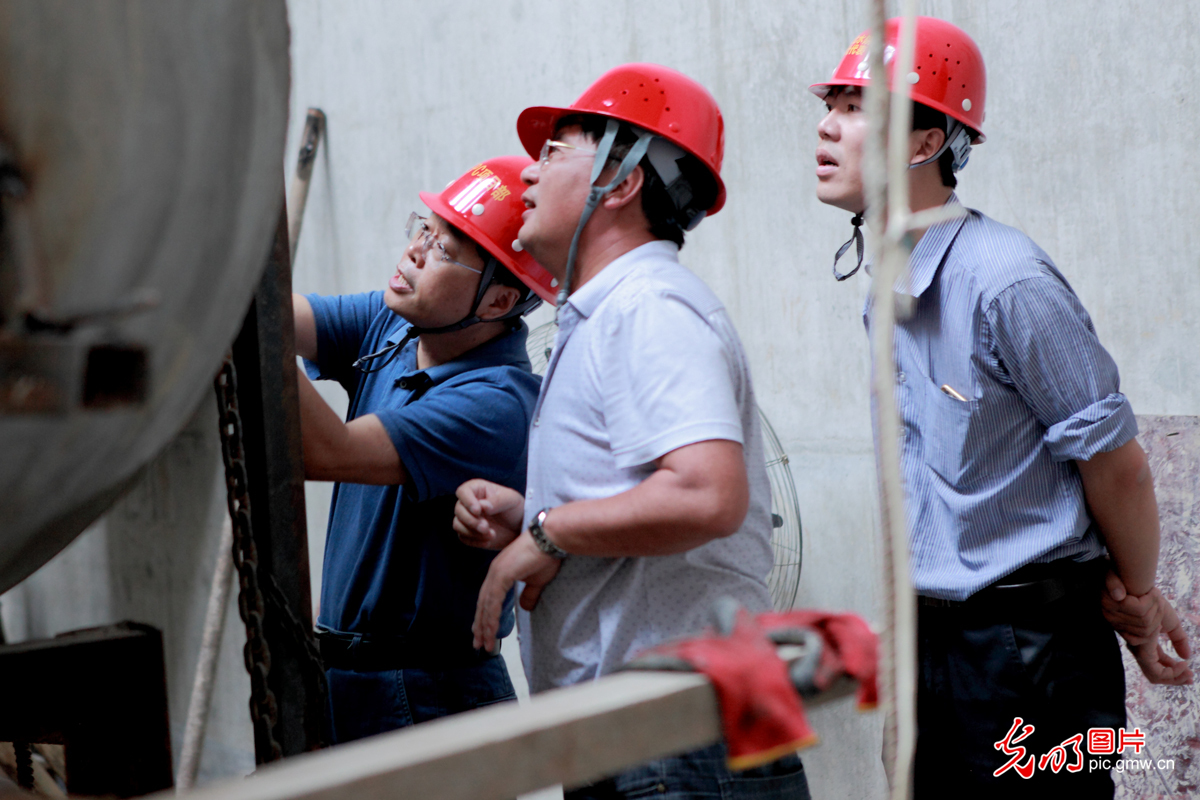 “干一行就要爱一行,只有放手去干才会知道能不能行,哪怕是碰一鼻子灰,也不能畏难不上。”下定决心后,李瑞清带着团队,立足湖北省西高东低的地势条件和当地水资源有限、客水丰富的独特水情,以长江水补汉江水位依托,有利条件与治水理念相结合,通过“三横两纵”水利“蓝图”:以鄂北地区水资源配置工程、荆门市荆东补水工程、一江三河工程为横轴,以引江补汉工程、引江济汉工程为纵轴,建立全省水资源建设总体战略格局。图为李瑞清(左一)检查鄂北工程项目进度。(湖北省水利水电规划勘测设计院提供)