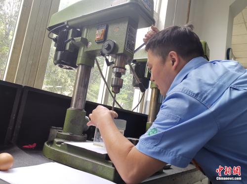 张新停在演示鸡蛋上给纸钻孔。张旭 摄