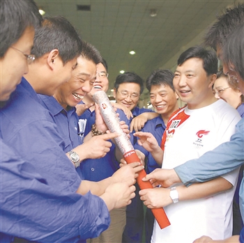 2008年,李斌参加完北京奥运会火炬接力仪式后,带着奥运火炬与工友们分享喜悦。
