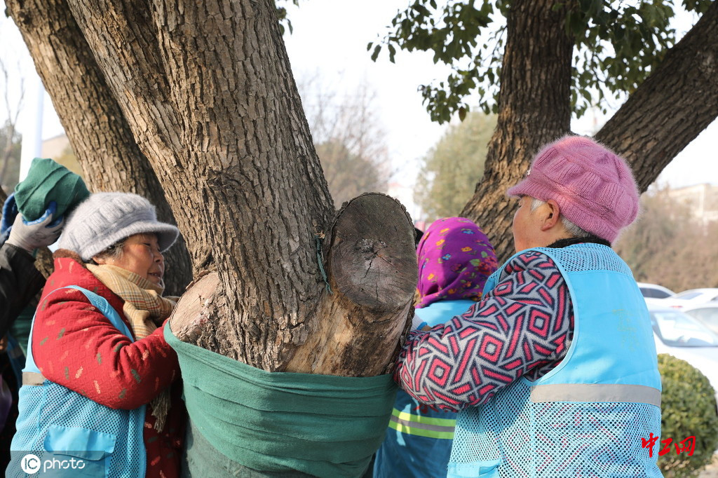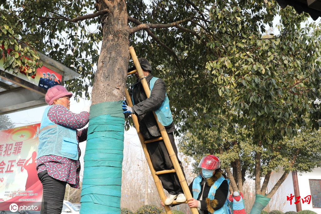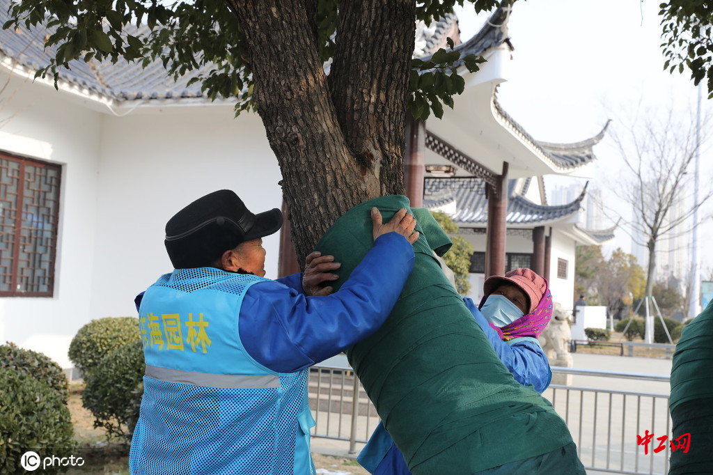 2021年1月6日,江苏省连云港市东海县园林绿化工人对不耐寒园林绿化树木增加防寒保暖措施。当日,该县受强冷空气影响,最低气温低至零下13摄氏度至零下15摄氏度,园林工人对香樟、广玉兰等不耐寒树木采取提高无纺布包裹高度,从原来的包裹2米延伸到树干分叉点,同时对低矮灌木采取全部包裹措施,减少低温对绿化造成的影响。 (柴军委/IC photo)