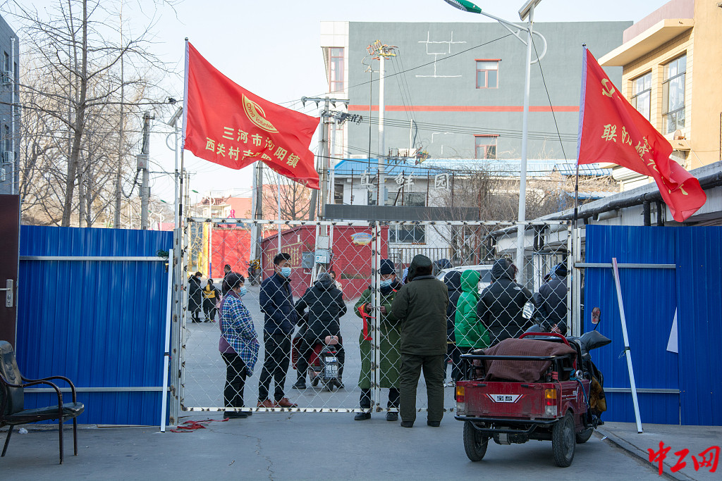 2021年1月13日,河北廊坊,实拍三河市西关村附近防疫情况。自2021年1月12日中午12时起,三河市全市范围内实行村民、居民出入管控,除生病就医、疫情防控和保障公共事业运行等涉及国计民生的重要岗位需要外,村民、居民居家隔离期间不得外出、不得进京。邹明/人民视觉