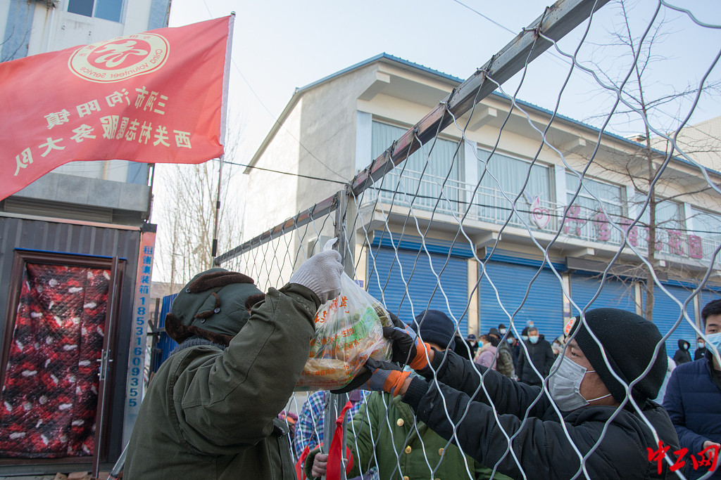 2021年1月13日,河北廊坊,三河市西关村村口,送菜人员将蔬菜等物资从门口递入。
