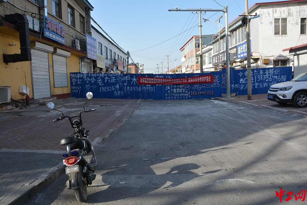 2021年1月13日,河北廊坊,三河市西关村附近街口被铁板封堵。