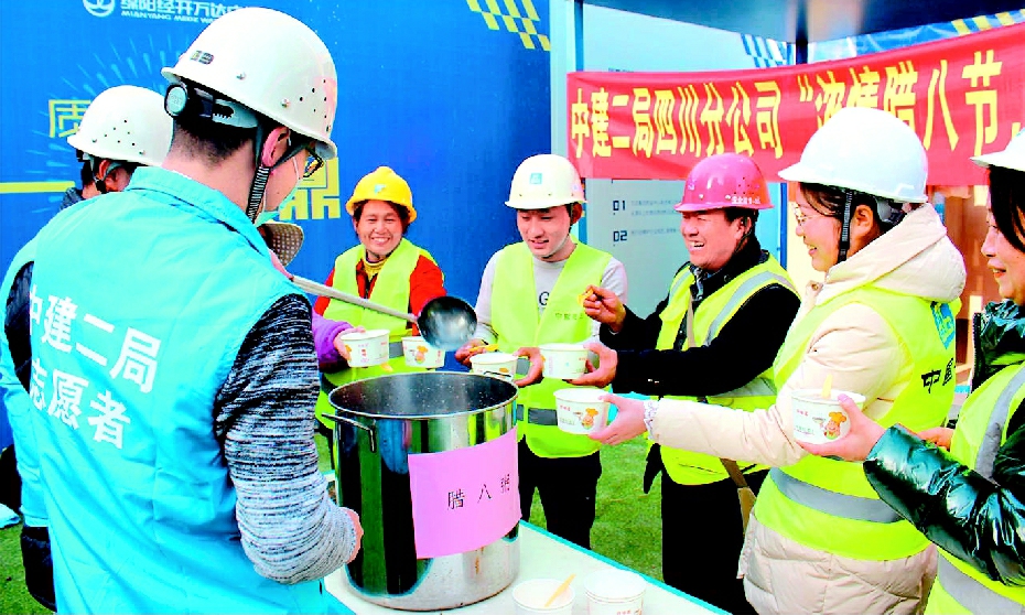 1月20日,中建二局四川分公司联合绵阳经开区总工会走进绵阳万达项目部,启动工地腊八节“‘粥’到暖人心”关爱农民工群体系列活动,多措并举做好农民工春节错峰休假保障工作,鼓励务工人员“原地过年”。