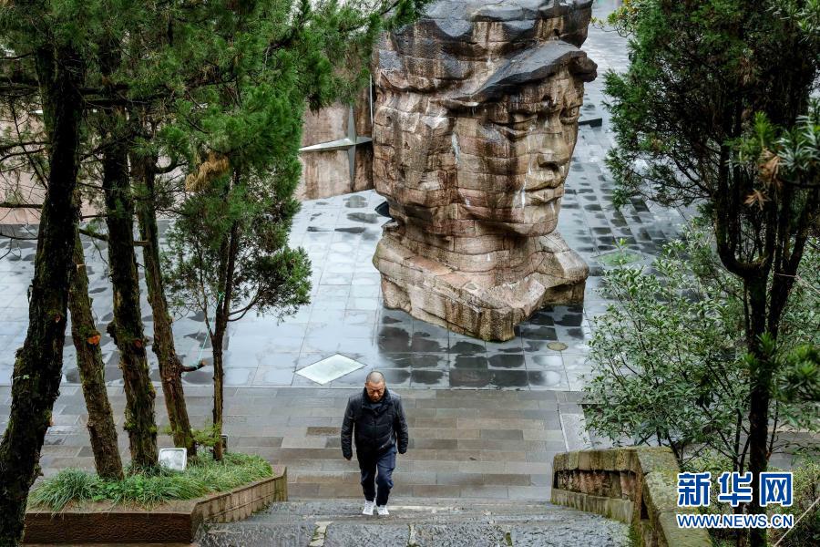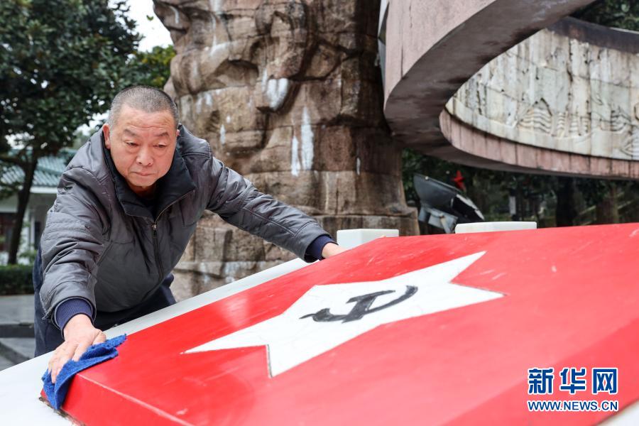 1月25日,杨爱民在遵义红军烈士陵园内擦拭雕塑。新华社记者 欧东衢 摄