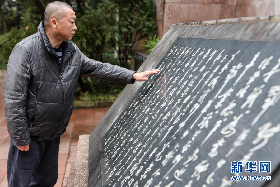 1月25日,杨爱民在遵义红军烈士陵园内的邓萍同志墓前检查石碑老化情况。新华社记者 欧东衢 摄