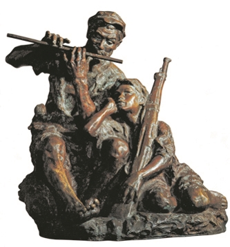 雕塑《艰苦岁月》创作于1956年。作品成功地通过老战士吹笛、小战士偎依身旁倾听的造型,体现出战争年代的革命乐观主义精神和向往革命胜利的信念。