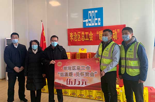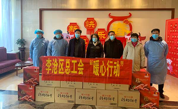 同时,李沧区总工会设立了100万元稳岗留工保障资金,将重点走访辖区重点工程项目、环卫工人、医护人员、疫情一线值守人员以及外来务工留青过节人数较多的企业,开展送年货、送礼包等系列慰问活动。连日来,李沧区委副书记魏瑞雪、区人大副主任、区总工会主席朱元庆及区总工会有关领导先后来到项目工地、防疫酒店走访慰问,加强疫情防控和安全生产宣传指导,并送去物资和慰问金,重点对留青过节的外来务工人员、防疫一线工作人员给予关怀和帮扶。