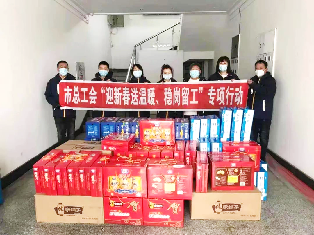 为贯彻落实全国总工会等七部门《关于开展“迎新春送温暖、稳岗留工”专项行动的通知》要求,按照中央、省、市委的决策部署,进一步发挥工会组织在打好疫情防控攻坚战中的积极作用,齐齐哈尔市总工会倡导广大职工留在本地过年,开展了“你留在鹤城过年,我为您的亲人送礼包”特别关爱活动,对中国一重、中车齐车、益海嘉里等20户产教融合成员企业中,留在本地过年的单身职工,送去节日的特别关爱,为每名留在本地过年的单身职工的家属送去鹤城特产礼包,免费邮寄回老家。