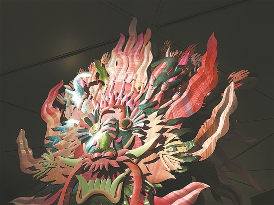 在广州美术学院上学时,陈粉丸就爱上了手工,在不断的实践中,她发现用纸张的艺术创作空间很大,于是开启了她的纸艺之路。此次展出的《不息》和《转运花园》都是陈粉丸的纸艺作品,其中,《不息》远远望去就像是一条粉红色的巨龙,看不到终点,但这条巨龙又可以分拆成多个部分,观众可以做出自己的解读。如果从作品的细微处看,能发现龙的眼睛是两位小人,而鳞片也暗藏着很多个小人儿和手臂,陈粉丸介绍说,她本身非常喜欢观察人的手,如今大家都戴着口罩,手部能够传递出更多的信息,“每位观众都能对这些手臂有自己的解读”。
