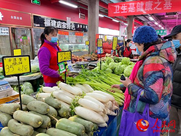 “卖啥的都有,不缺货,物价也还可以,春节不打算专门囤菜。”在北京市朝阳区大黄庄便民市场,董大妈熟练地扫码、测温,赶早进入市场,挑选了新鲜的白菜、萝卜、黄瓜、草莓、橘子,花了43.6元。