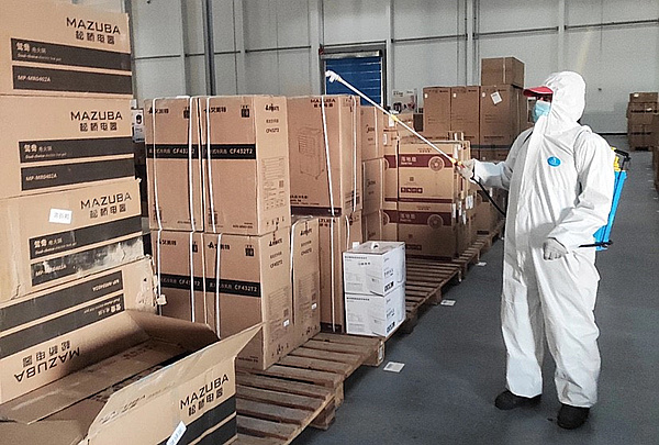 苏宁物流工作人员正在对仓储场所进行消毒。苏宁易购供图