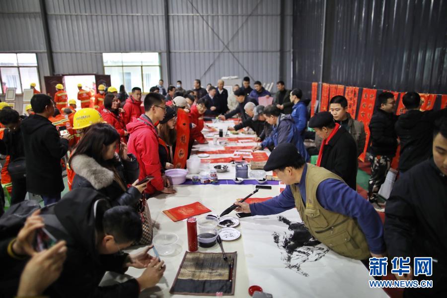 当日,贵阳市太金线中铁五局路桥公司牛角坡隧道项目部热闹非凡,来自贵州省总工会的文艺爱好者写春联、献歌舞,为就地过年的职工送上新春祝福。