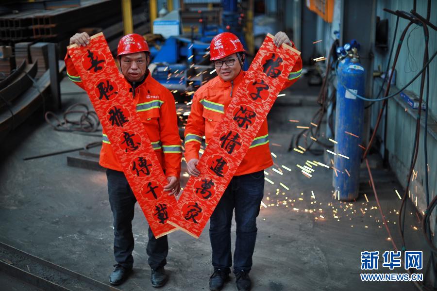 2月2日,两名职工在工地上展示获赠的春联。新华社记者 刘续 摄