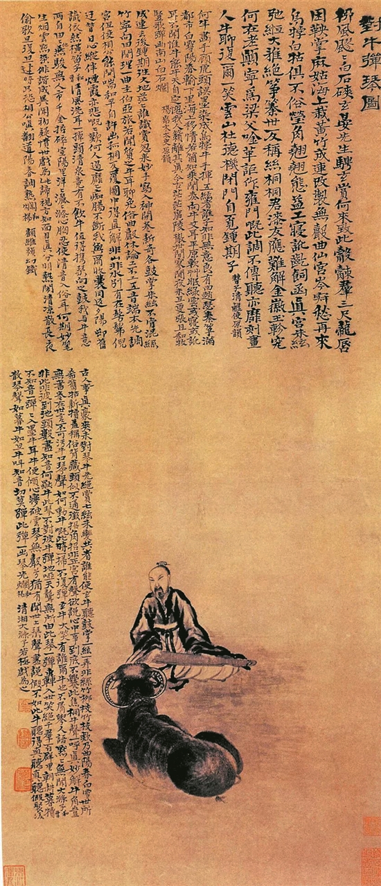 《对牛弹琴图》正是石涛晚年的重要作品,画面简约,仅一士、一琴、一牛而已。一高士正面而坐,目视前方,神情静穆,手抚琴弦;一玄牛面向高士而卧,全神贯注,侧耳倾听,如痴似醉。背景空旷,似琴声萦绕其上,余音袅袅。水墨绘就,浓淡相间,不着一色,笔墨洗练,构图奇险,大片的留白,给人以想象的空间。其上题跋和诗占据了大量版面。如“世上琴声尽说假,不如此牛听得真”“牛声一呼真妙解,牛角岂无书卷在”等诗句,让人感到此画更有“言外之意”、“象外之象”。
