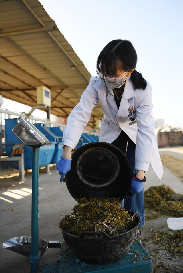 ↑2月5日,西北农林科技大学肉牛科技创新团队成员龙凤在国家肉牛改良中心为牛配饲料。