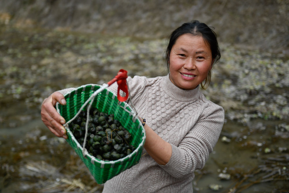浙江省丽水市云和县养殖户严丽英正在向记者展示自家田里收获的田螺。新华社记者 黄宗治 摄