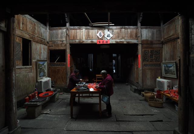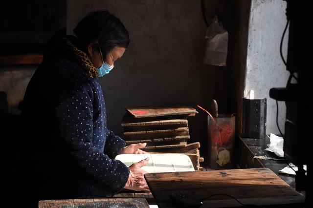 ↑2月7日,安徽省宣城市泾县查济村的村民在家中整理刚做好的年豆腐。