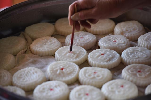 ↑2月6日,按传统春节习俗,安徽省宣城市泾县查济村的村民在刚做好的米粿上“点胭脂”。