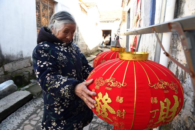 ↑2月6日,安徽省宣城市泾县查济村的村民在家门口挂红灯笼。