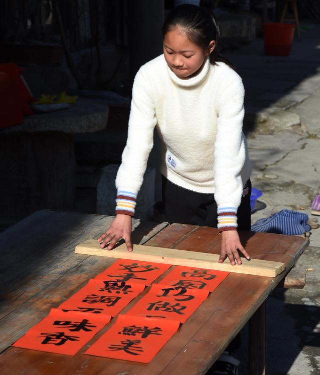 ↑2月6日,安徽省宣城市泾县查济村的村民晾晒刚写好的春联。