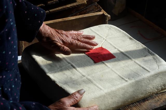 ↑2月6日,按传统春节习俗,安徽省宣城市泾县查济村的村民在刚做好的年豆腐上放上红纸。