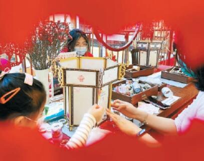 在旁边的团扇体验区,经过老师的指导,两位年轻姑娘拥有了属于自己的新年团扇,红色的绸面上,贴着闪闪发光的装饰品,显得格外喜庆。而难度最高的宫灯体验也吸引了不少有耐心的体验者,经过一个小时的努力,就可以亲手拼装成属于自己的宫灯。