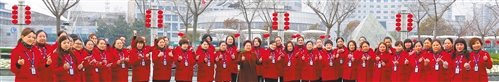 2月12日,江苏省南通市亚萍国际购物商场前,留在当地过大年的员工聚在一起,喜迎新春。 季烨炜摄