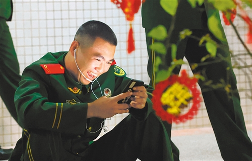 2月11日,武警广东总队执勤第三支队三中队上等兵陈俊江在与家人视频拜年。 廖 键摄