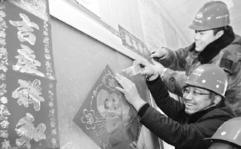 天津地铁8号线4标项目建设者在贴福字。 高鹏 摄