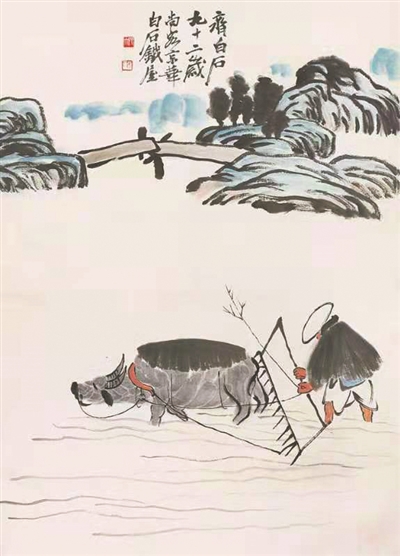 齐白石晚年喜画《耕牛图》。多以南方春季为背景,描绘老农雨中扶耖而耕的场景,笔墨简练而富有诗情画意。不过,齐白石92岁时所画的一幅《耕牛图》,却被现在的网友找出多处“错误”:
