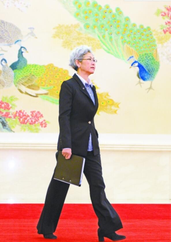 2013年3月15日,傅莹进入人民大会堂金色大厅主持总理记者会。