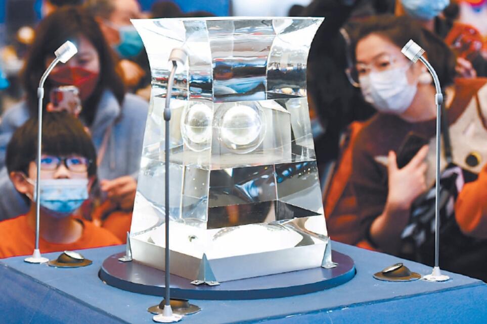 展厅里,蓝色星空为背景,水晶容器里的月球样品001号在灯光映衬下熠熠生辉。月壤容器设计师介绍,盛放月壤的容器材质为人造水晶,设计思路借鉴了馆藏青铜尊,整体风格显示出稳重之感。容器内部由地球、中国地图、月球、月壤等组成。其中“地球”与“月球”间相隔9.9厘米,取意古人所描绘的“天有九霄”,寓意中国探月突破极限、跨越“九重”。