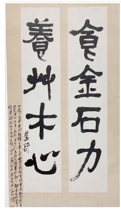 ◆吴昌硕赠予王个簃的隶书四言联“食金石力,养草木心”。