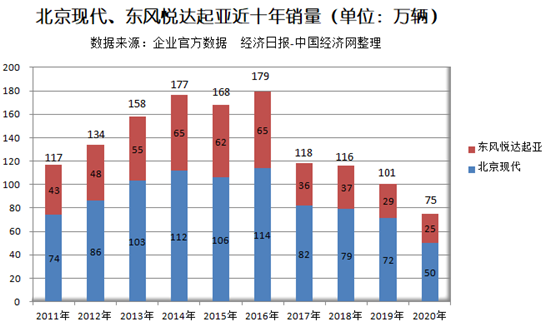 4S店数量大幅减少的背后,是韩系车销量的跌跌不休。根据北京现代和东风悦达起亚官方公布的数据,2013年至2016年间,两家企业总销量在160万-180万辆的高位上下波动,但自2017年起,便开始断崖式下跌,至今一蹶不振。数据显示,2020年,北京现代和东风悦达起亚总销量仅为75万辆左右,大幅下滑25%。