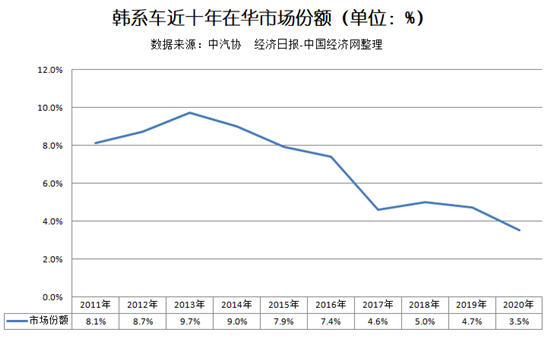 伴随着销量持续走低,韩系车的市场份额也呈现逐年下滑的趋势。据中汽协数据,2013年,韩系车在华市场份额一度高达9.7%,但2017年突然跌至4.6%;到2020年,韩系车在华市场份额进一步下探至3.5%。