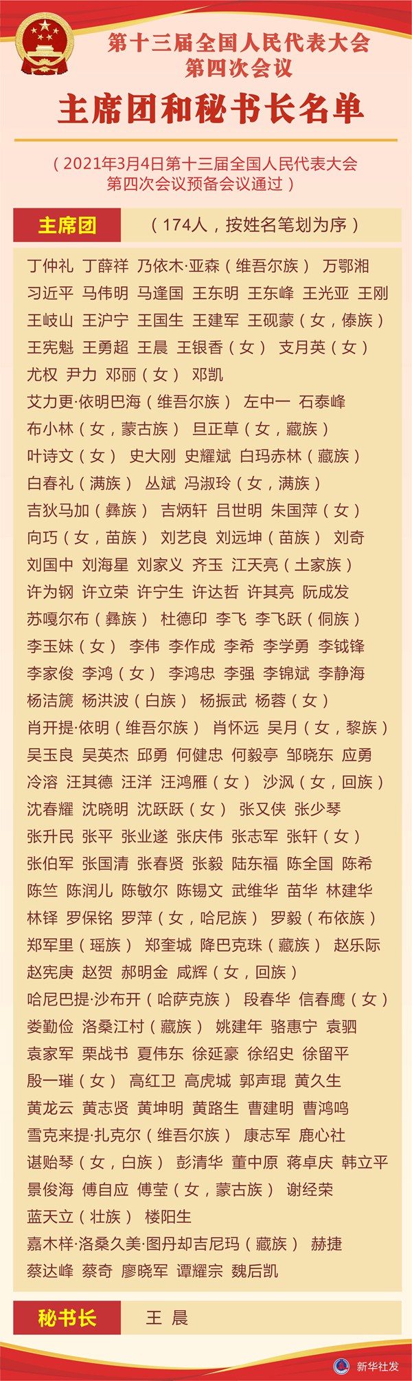 第十三届全国人民代表大会第四次会议主席团和秘书长名单