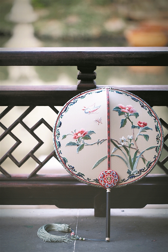 团扇,又称“宫扇”“纨扇”“合欢扇”,有数千年的悠久历史。古人寄情于物,将团扇喻为圆月,蕴含了团圆的寓意。清人王廷鼎在《杖扇新录》中说:“团扇近世通用素绢,两面绷之,或泥金、瓷青、湖色,有月圆、腰圆、六角诸式,皆倩名人书画,柄用梅洛、湘妃、棕竹,亦有洋漆、象牙之类。”可见团扇形制、款式甚多。精美的团扇扇面常用绸、缎、纱、罗甚至织锦、缂丝等高级织物制作,或辅以刺绣、手绘等,山水亭台、人物花鸟、清词丽句等优美画面跃然于扇面之上。