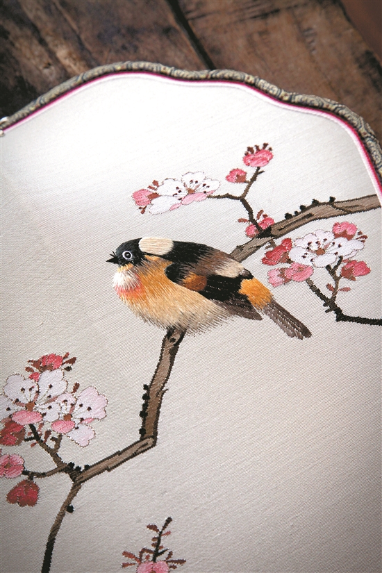 缂丝的特点是“通经断纬”,成品精美,但做起来周期长,难度大。缂丝和刺绣一样,都非常适宜展示书画作品。在一幅扇面上,可以用缂丝或刺绣逼真地呈现画作,为此可用到几十种、甚至上百种颜色。相较之下,刺绣更能接近原画,它的局限性更小。但同时,刺绣的实用性不如缂丝。一些精细的刺绣作品,一根丝线甚至可以被劈成原线 几十分之一的细度,能充分表现色彩的细微变化,也拥有很高的光泽度,但它的娇贵程度也注定了很多刺绣作品要隔着玻璃欣赏。缂丝则不同,更加耐损,不容易起毛,它的实用性要更高。