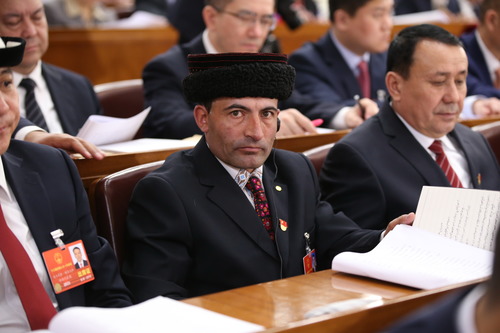 △2018年3月18日,全国人大代表拉齐尼·巴依卡(塔吉克族)在北京人民大会堂出席十三届全国人大一次会议开幕会。新华社记者 姚大伟 摄