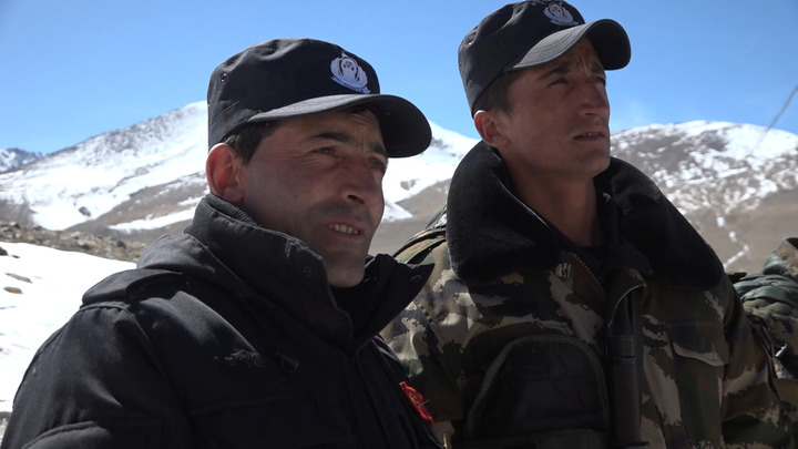 △2021年1月20日,在新疆红其拉甫边境线上,拉齐尼·巴依卡(左)和护边员在巡逻途中(视频资料截图)。