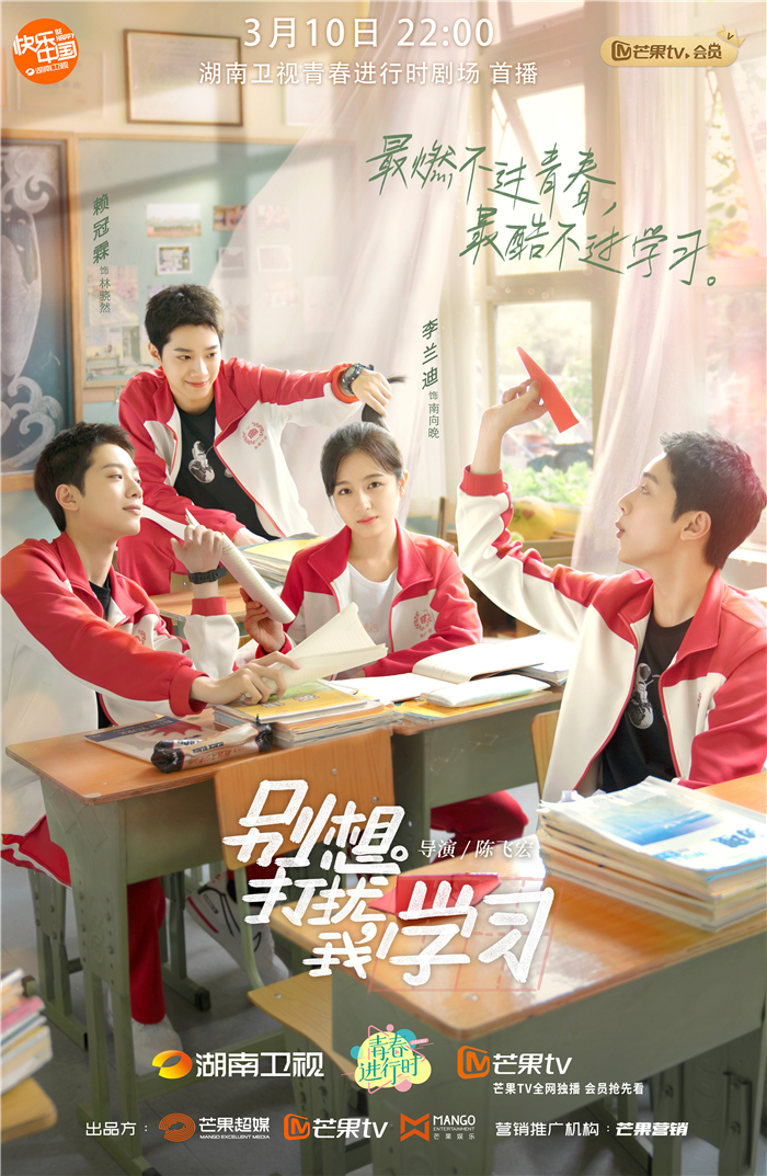 3月8日,由芒果超媒、芒果TV、芒果娱乐联合出品,总制片人张琳熙、导演陈飞宏等主创实力操刀,赖冠霖、李兰迪主演,王润泽、陈姝君、赵珞然、张琛、白妤霏、赵轩等青年演员出演,改编自网络作家月流光原著同名小说的全国首部聚焦学习的青春成长剧《别想打扰我学习》,定档于3月10日22:00在湖南卫视青春进行时剧场首播,每周一到周四22:00每天2集,芒果TV全网独播,每周一至周四24:00会员抢先看。随着定档信息的公布,预告片也同步释出,短短2分多钟给我们呈现出了一幅青春校园热血之卷。