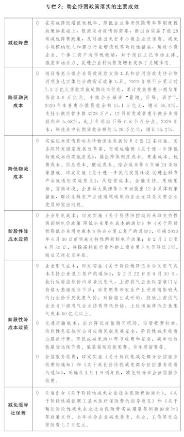 二是助企纾困政策有效实施。减税降费红利深度释放,实施阶段性大规模减税降费,阶段性减免小规模纳税人增值税,阶段性减免养老、失业、工伤三项社会保险单位缴费部分,减半征收职工医疗保险单位缴费部分,落实住房公积金阶段性支持政策,全年为市场主体减负超过2.6万亿元。创新宏观政策实施方式,中央财政对新增2万亿元资金建立直达机制,省级财政加大资金下沉力度,共同为市县基层落实惠企利民政策及时补充财力。通过降低存款准备金率、中期借贷便利、公开市场操作、再贷款再贴现、创新直达实体经济的货币政策工具等方式,共推出9万多亿元的货币支持措施。通过贷款市场报价利率(LPR)改革推动社会融资成本下降。大型商业银行普惠小微企业贷款增长50%以上,全年金融系统向实体经济让利1.5万亿元。阶段性对部分服务业小微企业和个体工商户减免缓收房屋租金。